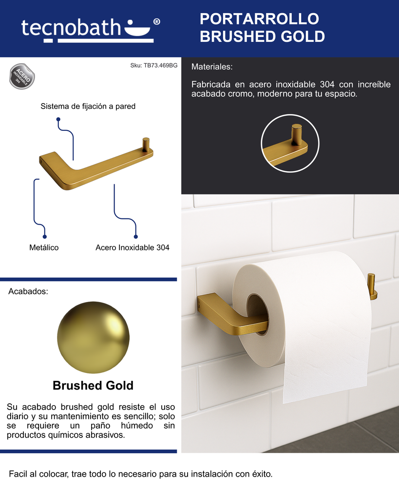 Este portarrollos de Tecnobath combina diseño contemporáneo y materiales de alta calidad para brindar funcionalidad con un toque estético. Fabricado en acero inoxidable, con elementos de fijación de latón, ofrece una sujeción firme y un acabado de lujo ideal para todo tipo de baños.