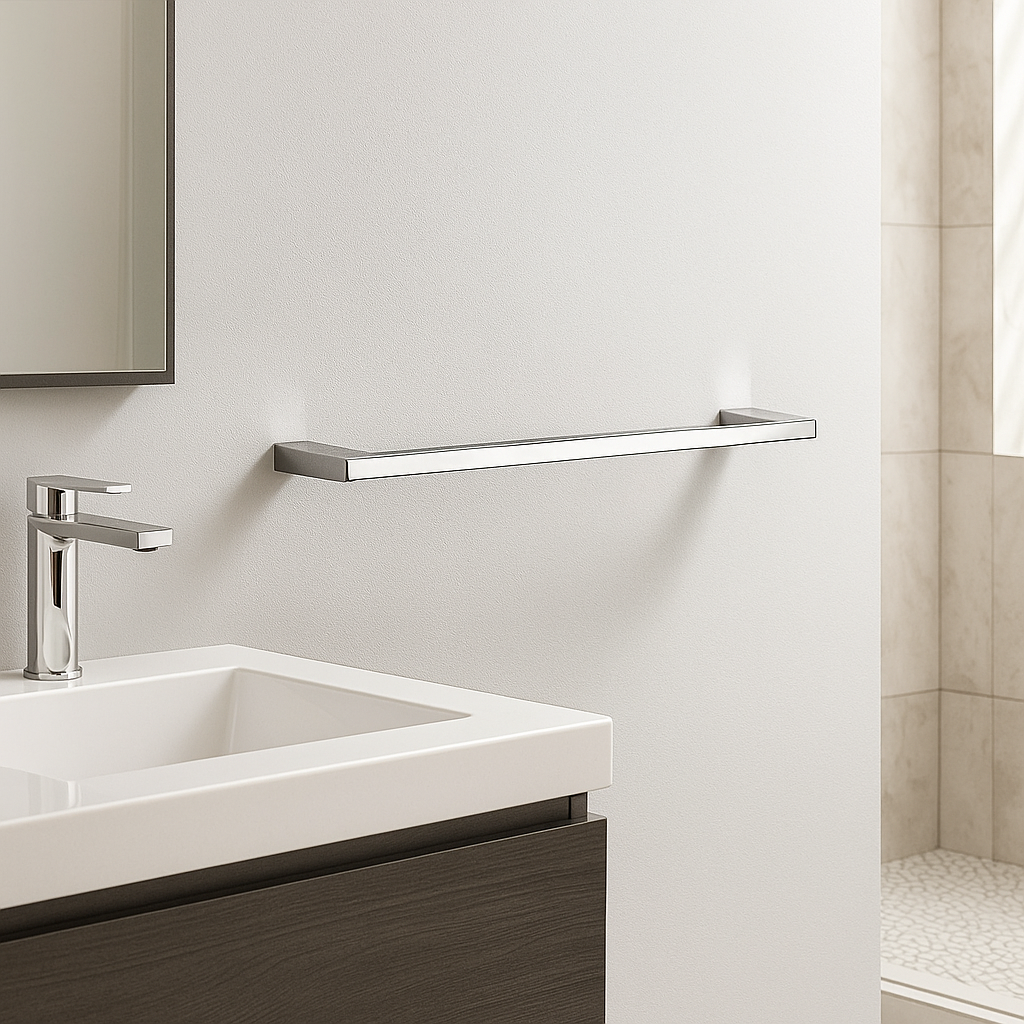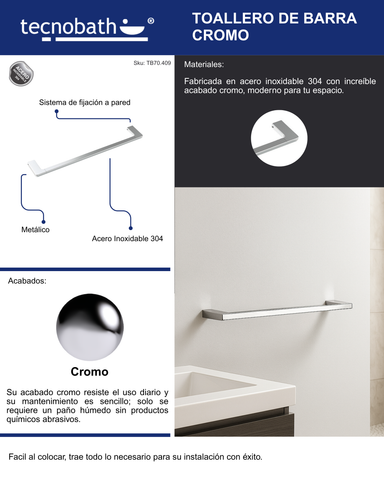 El toallero de barra de Tecnobath es ideal para colocar junto al lavabo, la regadera o el WC, ofreciendo un diseño limpio y funcional para colgar toallas de manera cómoda. Fabricado en acero inoxidable, combina durabilidad y estética en distintos acabados modernos.