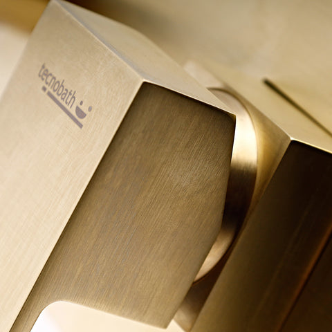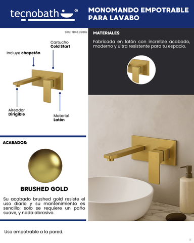 Monomando empotrable para lavabo Tecnobath Línea Row, fabricado en latón con empotre metálico. Incluye aireador ecológico dirigible y cartucho Cold Start. Disponible en acabados cromo, negro mate, brushed gold y gris oxford.