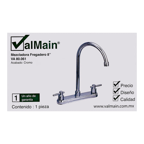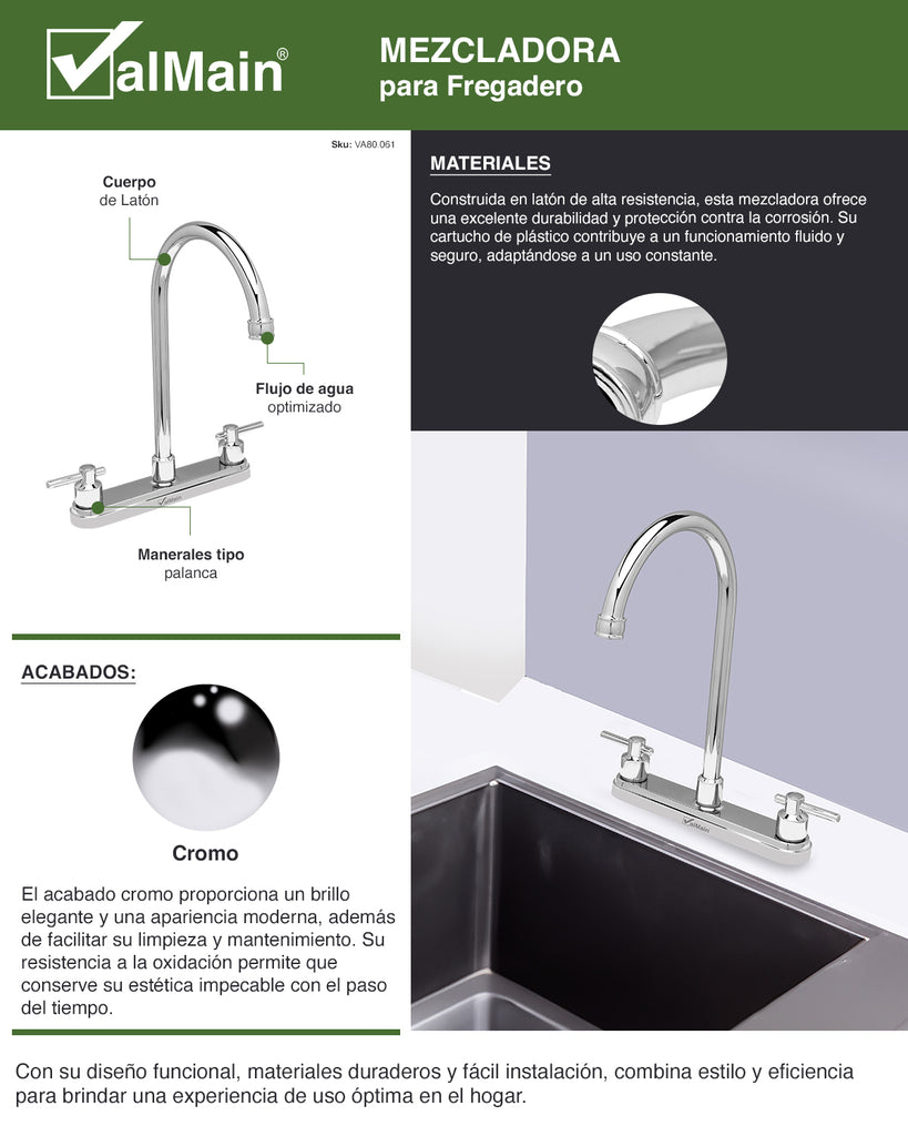 La mezcladora de Valmain está diseñada para ofrecer funcionalidad, resistencia y una estética adaptable a cualquier tipo de cocina. Fabricada con una combinación de ABS, zinc y latón, brinda un equilibrio ideal entre durabilidad y ligereza. Su acabado cromo brillante y manerales curvos le otorgan un estilo moderno, cómodo y fácil de integrar en cocinas de cualquier diseño.