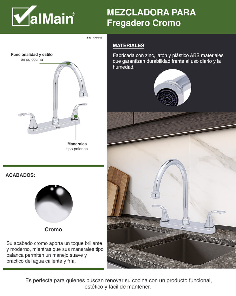 La mezcladora de Valmain combina materiales resistentes con un diseño elegante y versátil, ideal para cualquier tipo de cocina. Su construcción en ABS, zinc y latón ofrece un equilibrio entre ligereza y durabilidad, mientras que su acabado cromo brillante le da un toque moderno y fácil de combinar. Sus manerales curvos aportan comodidad y estilo al uso diario.