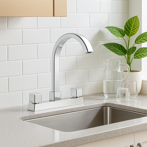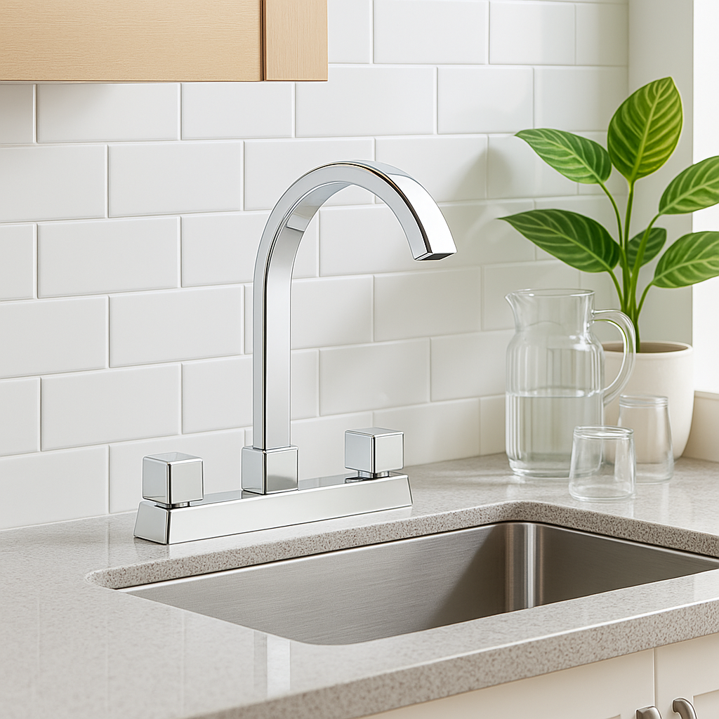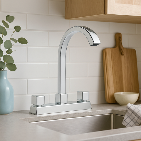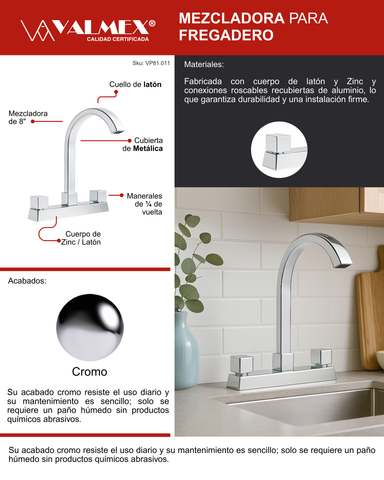 La mezcladora de Valmex es una opción robusta y confiable, ideal para cocinas que requieren durabilidad y rendimiento. Cuenta con cuerpo de zinc, cuello y conexiones en latón, y una cubierta metálica que refuerza su estructura. Su diseño con manerales tipo cruz brinda un manejo ergonómico y preciso, incluso en ambientes de uso intensivo.