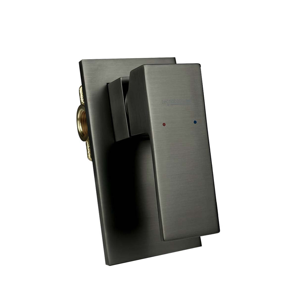 Monomando empotrable para regadera Tecnobath, fabricado en latón con cartucho cerámico europeo. Incluye chapetón y empotre metálico. Disponible en acabados cromo, negro mate, brushed gold y gris oxford.