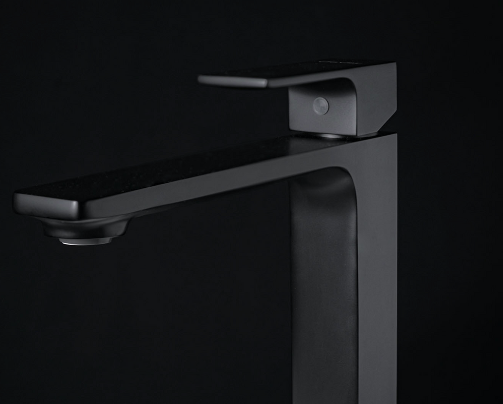 Monomando alto para lavabo Tecnobath, fabricado en latón con aireador ecológico dirigible y cartucho Cold Start. Disponible en acabados cromo, negro mate, brushed gold y gris oxford.