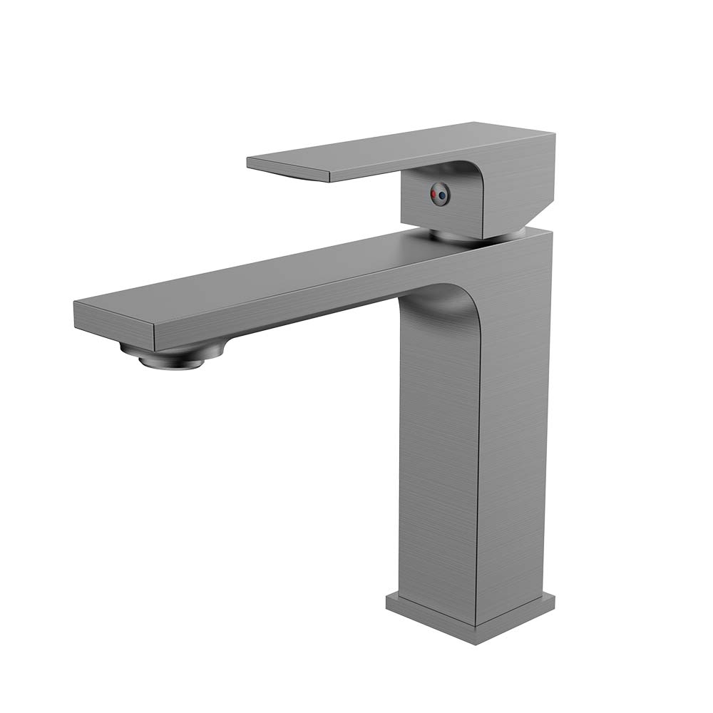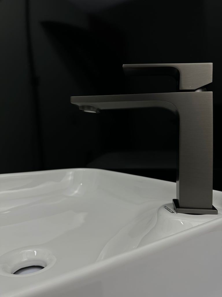 Monomando corto para lavabo Tecnobath, fabricado en latón con aireador ecológico dirigible y cartucho Cold Start. Disponible en acabados cromo, negro mate, brushed gold y gris oxford.