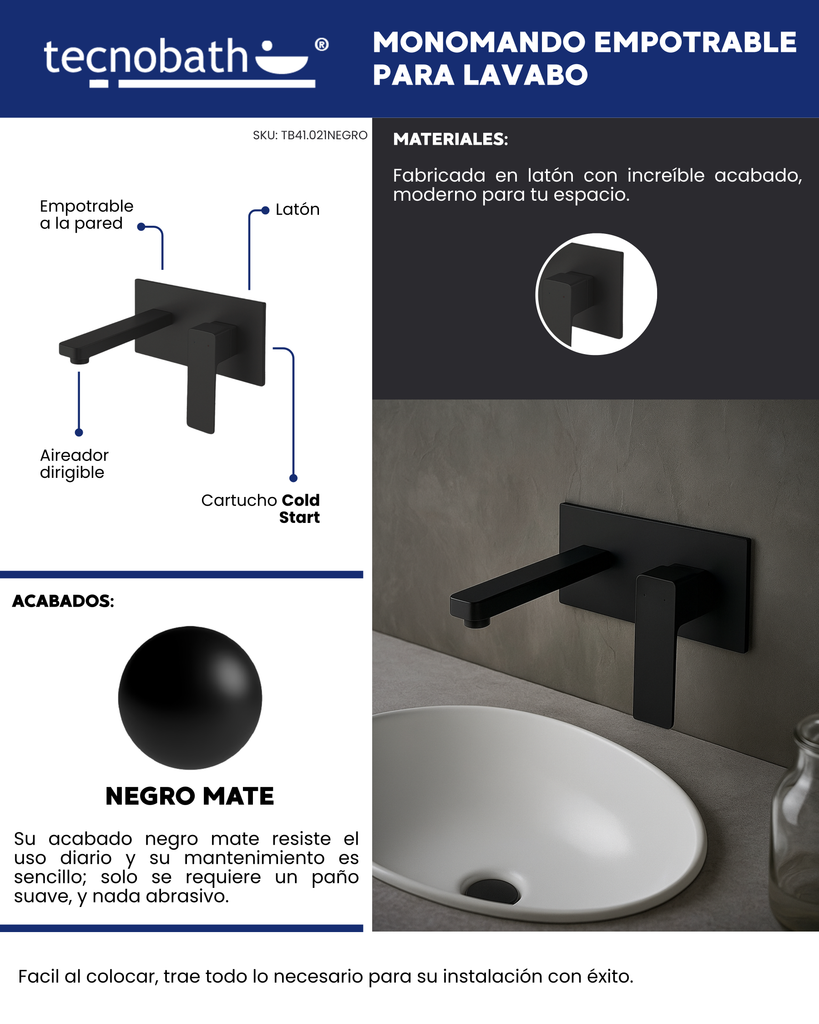 Monomando empotrable para lavabo Tecnobath Línea Row, fabricado en latón con empotre metálico. Incluye aireador ecológico dirigible y cartucho Cold Start. Disponible en acabados cromo, negro mate, brushed gold y gris oxford.