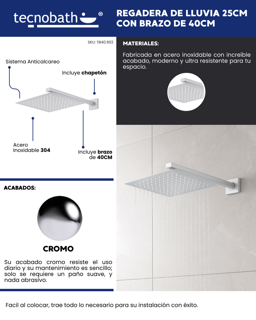 Regadera Row de Tecnobath, disponible en acabados premium. Incluye brazo de 40 cm en acero inoxidable, sistema anticalcáreo y conexión NPT de 1/2".